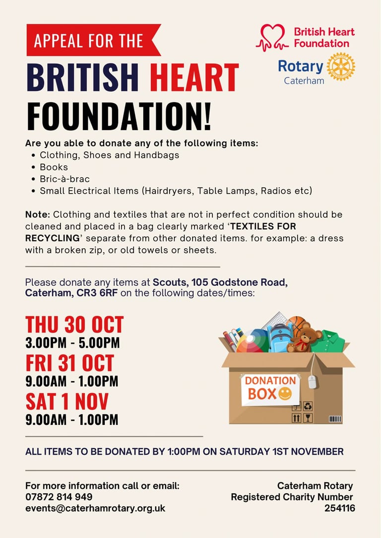 Join the Rotary Club of Caterham in our collection drive to help fund life-saving research into heart and circulatory diseases.